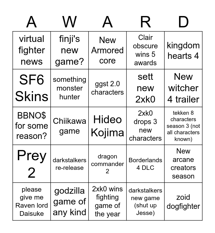 This bingo card has a free space and 24 words: darkstalkers re-release, godzilla game of any kind, ggst 2.0 characters, please give me Raven lord Daisuke, kingdom hearts 4, virtual fighter news, SF6 Skins, finji's new game?, 2xk0 drops 3 new characters, dragon commander 2, sett new 2xk0, BBNO$ for some reason?, Borderlands 4 DLC, New arcane creators season, something monster hunter, darkstalkers new game (shut up Jesse), tekken 8 characters season 3 (not all characters known), New Armored core, New witcher 4 trailer, Chiikawa game, zoid dogfighter, Prey 2, Clair obscure wins 5 awards and 2xk0 wins fighting game of the year.