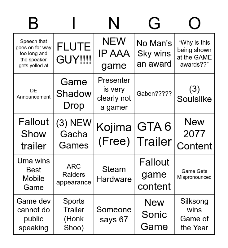 This bingo card has a free space and 24 words: ARC Raiders appearance, Sports Trailer (Honk Shoo), Presenter is very clearly not a gamer, Game dev cannot do public speaking, “Why is this being shown at the GAME awards??”, Speech that goes on for way too long and the speaker gets yelled at, DE Announcement, FLUTE GUY!!!!, GTA 6 Trailer, Steam Hardware, Gaben?????, Fallout Show trailer, Fallout game content, Game Gets Mispronounced, Game Shadow Drop, New Sonic Game, New 2077 Content, NEW IP AAA game, (3) Soulslike, (3) NEW Gacha Games, Silksong wins Game of the Year, Uma wins Best Mobile Game, No Man's Sky wins an award and Someone says 67.