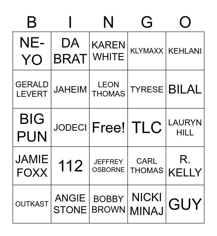 This bingo card has a free space and 24 words: 112, ANGIE STONE, LEON THOMAS, OUTKAST, KEHLANI, NE-YO, GERALD LEVERT, DA BRAT, TLC, JEFFREY OSBORNE, TYRESE, BIG PUN, CARL THOMAS, R. KELLY, JAHEIM, NICKI MINAJ, LAURYN HILL, KAREN WHITE, BILAL, JODECI, GUY, JAMIE FOXX, KLYMAXX and BOBBY BROWN.