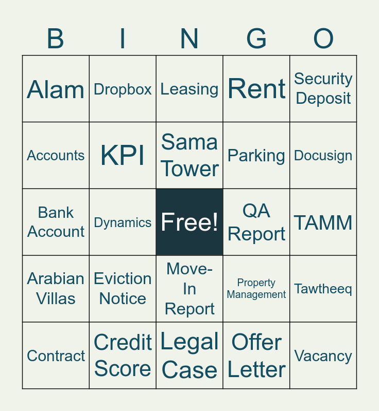 This bingo card has a free space and 50 words: A3 Building, Credit Score, Occupant, Offer Letter, Tawtheeq, Community Management, Dropbox, Musaffah, Parking, Tenant, Accounts, KPI, Property Management, Vacancy, Al Ain Tower, Goyzer, Leasing, QA Report, Trade License, Alam, Eviction Notice, Legal Case, Rent, Docusign, Amwaj Tower, Key Handover, Sama Tower, Renewal, Security Deposit, Arabian Villas, IYAD, Maintenance, Rack Rate, Silver Tower, Asset Management, Facility Management, Mangrove Village, Receipt, UK Projects, Bank Account, Invoice, Megastore, Refund, Q Residence, Contract, Dynamics, Move-In Report, Regis House, TAMM and OASIS PM.