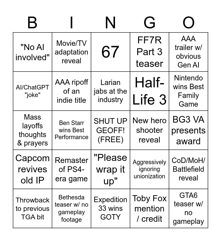 This bingo card has a free space and 24 words: Remaster of PS4-era game, Bethesda teaser w/ no gameplay footage, Larian jabs at the industry, Throwback to previous TGA bit, AAA trailer w/ obvious Gen AI, "No AI involved", AI/ChatGPT "joke", Movie/TV adaptation reveal, New hero shooter reveal, "Please wrap it up", Half-Life 3, Mass layoffs thoughts & prayers, Aggressively ignoring unionization, CoD/MoH/ Battlefield reveal, AAA ripoff of an indie title, Toby Fox mention / credit, BG3 VA presents award, 67, Nintendo wins Best Family Game, Ben Starr wins Best Performance, GTA6 teaser w/ no gameplay, Capcom revives old IP, FF7R Part 3 teaser and Expedition 33 wins GOTY.