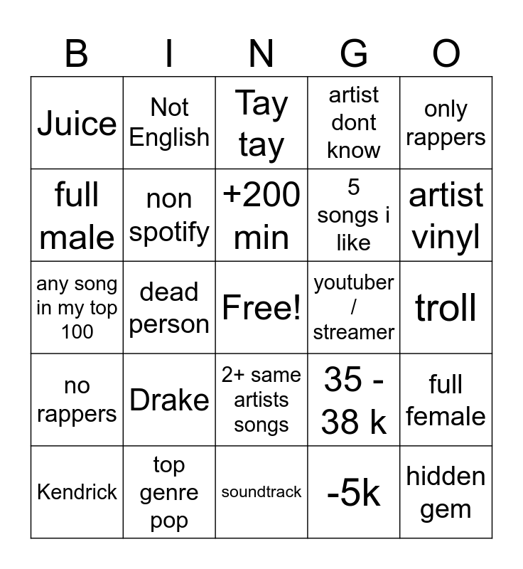 This bingo card has a free space and 24 words: Kendrick, Drake, +200 min, -5k, only rappers, Juice, Not English, Tay tay, youtuber / streamer, troll, any song in my top 100, non spotify, 35 - 38 k, full female, full male, top genre pop, soundtrack, artist dont know, artist vinyl, no rappers, dead person, 2+ same artists songs, 5 songs i like and hidden gem.