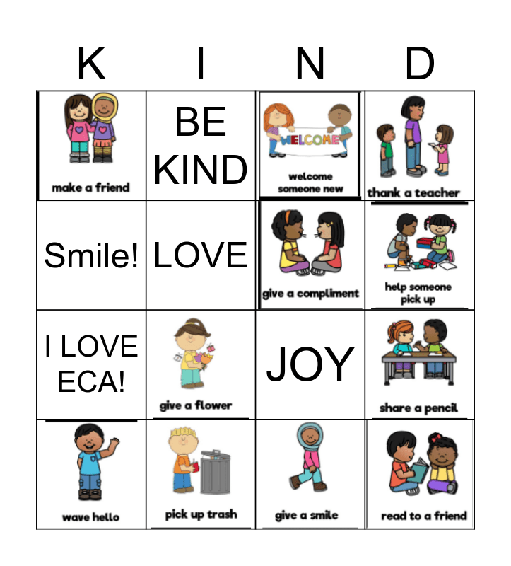 This bingo card has 24 images and 12 words: Smile!, BE KIND, JOY, PEACE, I LOVE ECA!, LOVE, FILL BUCKETS, BE THANKFUL, MERRY CHRISTMAS, HAPPY NEW YEAR, FIRST GRADE ROCKS! and say please.