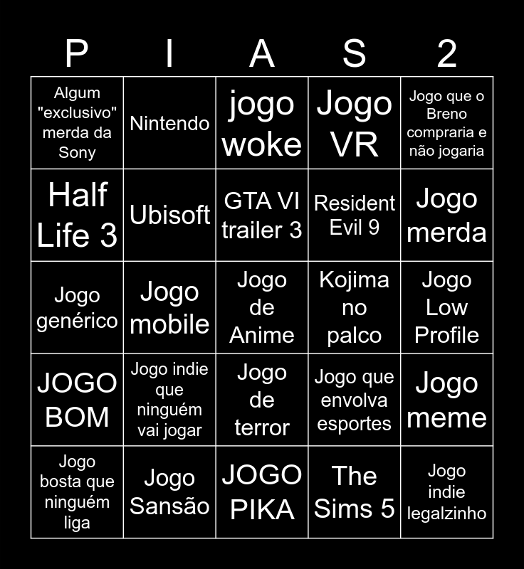 This bingo card has a free space and 24 words: Jogo indie que ninguém vai jogar, Jogo Sansão, GTA VI trailer 3, Jogo bosta que ninguém liga, Jogo que o Breno compraria e não jogaria, Algum "exclusivo" merda da Sony, Half Life 3, Nintendo, Kojima no palco, Jogo de terror, Resident Evil 9, Jogo genérico, Jogo que envolva esportes, Jogo meme, Ubisoft, The Sims 5, Jogo Low Profile, jogo woke, Jogo merda, Jogo mobile, Jogo indie legalzinho, JOGO BOM, Jogo VR and JOGO PIKA.