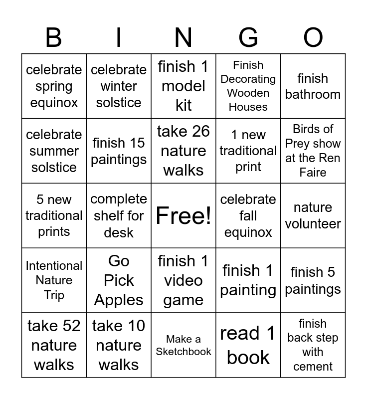 This bingo card has a free space and 24 words: Go Pick Apples, take 10 nature walks, take 26 nature walks, take 52 nature walks, finish bathroom, celebrate spring equinox, celebrate summer solstice, celebrate winter solstice, celebrate fall equinox, finish 1 video game, 1 new traditional print, 5 new traditional prints, finish 1 painting, finish 5 paintings, finish 15 paintings, read 1 book, nature volunteer, finish 1 model kit, Birds of Prey show at the Ren Faire, complete shelf for desk, finish back step with cement, Intentional Nature Trip, Finish Decorating Wooden Houses and Make a Sketchbook.
