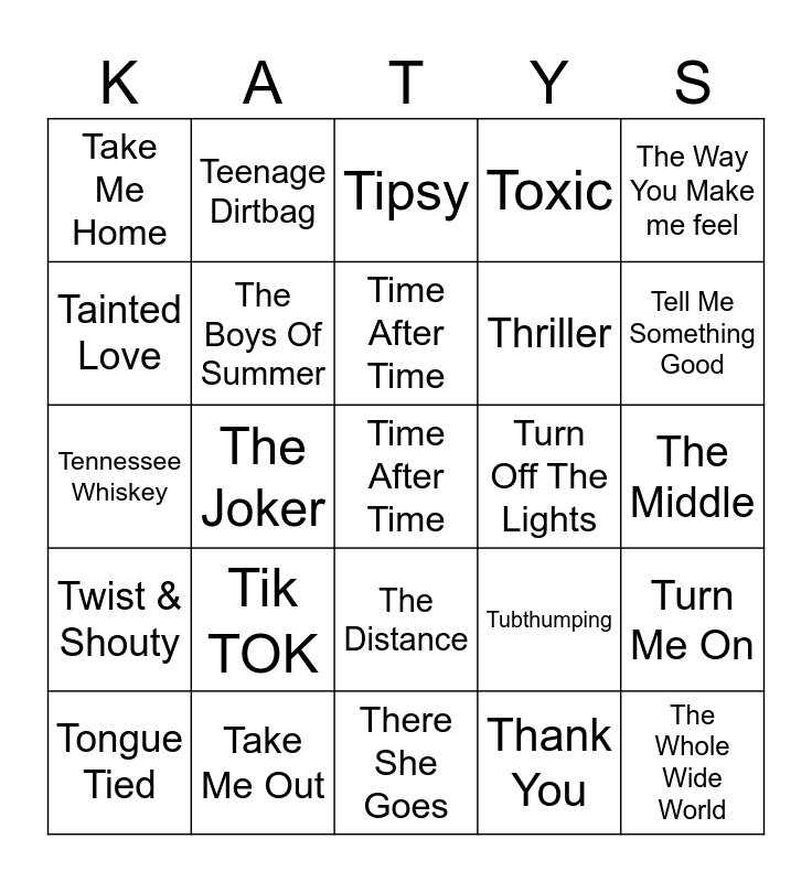 This bingo card has 36 words: Take On Me, Take Me Home, Talk Dirty To Me, The Boys Of Summer, Tubthumping, Twist & Shouty, Time After Time, This Is how WeDo, The Way You Make me feel, The Locomotion, The Joker, Toxic, Taking Care Of Business, Turn Off The Lights, Tell Me Something Good, Take Me Home, The Whole Wide World, Tik TOK, Time After Time, Tipsy, The Middle, Turn Me On, Take Me Out, Tongue Tied, There She Goes, Teenage Dirtbag, Tennessee Whiskey, Thong Song, Thriller, Tainted Love, Thank You For the Time, Tom Sawyer, Thank You, The Distance, This Must Be The Place and THAT THANG.