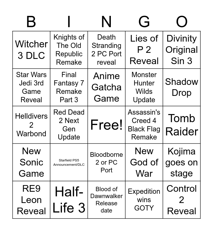 This bingo card has a free space and 24 words: Starfield PS5 Announcement/DLC, Half-Life 3, Anime Gatcha Game, RE9 Leon Reveal, Divinity Original Sin 3, Witcher 3 DLC, Star Wars Jedi 3rd Game Reveal, Knights of The Old Republic Remake, Assassin's Creed 4 Black Flag Remake, Bloodborne 2 or PC Port, Monster Hunter Wilds Update, Helldivers 2 Warbond, New God of War, Kojima goes on stage, Final Fantasy 7 Remake Part 3, Expedition wins GOTY, Tomb Raider, Death Stranding 2 PC Port reveal, Shadow Drop, Red Dead 2 Next Gen Update, Control 2 Reveal, New Sonic Game, Lies of P 2 Reveal and Blood of Dawnwalker Release date.