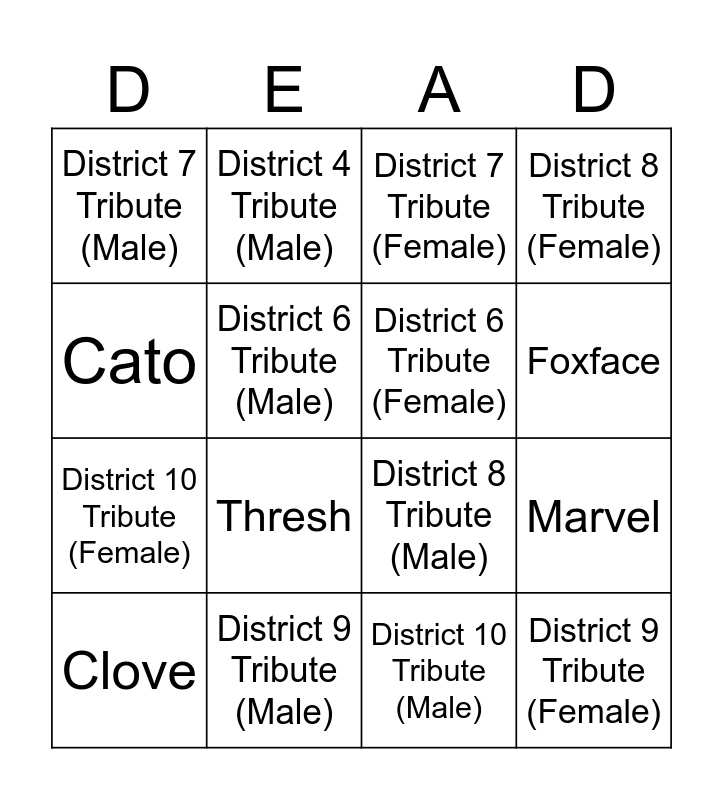 This bingo card has 22 words: District 9 Tribute (Male), District 3 Tribute (Female), District 4 Tribute (Male), District 5 Tribute (Male), District 6 Tribute (Male), District 6 Tribute (Female), District 7 Tribute (Male), District 7 Tribute (Female), District 8 Tribute (Male), District 9 Tribute (Female), District 10 Tribute (Female), District 8 Tribute (Female), Glimmer, District 4 Tribute (Female), District 10 Tribute (Male), District 3 Tribute (Male), Marvel, Clove, Thresh, Cato, Foxface and Rue.