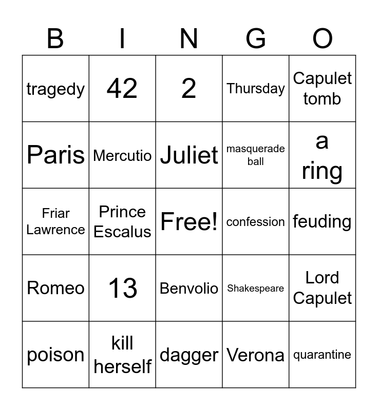 This bingo card has a free space and 34 words: Mantua, Verona, Friar John, Capulet, Romeo, Mercutio, Capulet tomb, poison, 42, Tybalt, Juliet, 2, Rosaline, Banishment, confession, a ring, kill herself, Friar Lawrence, 13, Shakespeare, Benvolio, tomb, tragedy, feuding, dagger, quarantine, Thursday, deaths, masquerade ball, Paris, the Nurse, Prince Escalus, Lord Capulet and flowers.