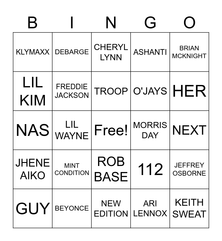This bingo card has a free space and 24 words: MINT CONDITION, BEYONCE, TROOP, GUY, BRIAN MCKNIGHT, KLYMAXX, LIL KIM, DEBARGE, MORRIS DAY, ROB BASE, O'JAYS, NAS, 112, JEFFREY OSBORNE, FREDDIE JACKSON, ARI LENNOX, NEXT, CHERYL LYNN, HER, LIL WAYNE, KEITH SWEAT, JHENE AIKO, ASHANTI and NEW EDITION.