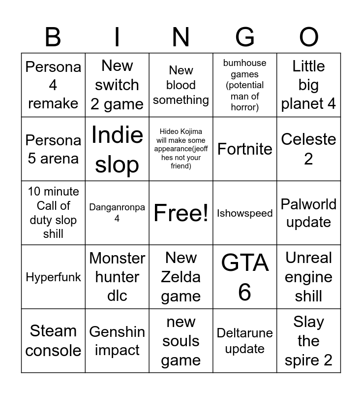 This bingo card has a free space and 24 words: Monster hunter dlc, Genshin impact, Hideo Kojima will make some appearance(jeoff hes not your friend), Steam console, Little big planet 4, Persona 4 remake, Persona 5 arena, New switch 2 game, Ishowspeed, New Zelda game, Fortnite, 10 minute Call of duty slop shill, GTA 6, Unreal engine shill, Indie slop, Deltarune update, Palworld update, New blood something, Celeste 2, Danganronpa 4, Slay the spire 2, Hyperfunk, bumhouse games (potential man of horror) and new souls game.