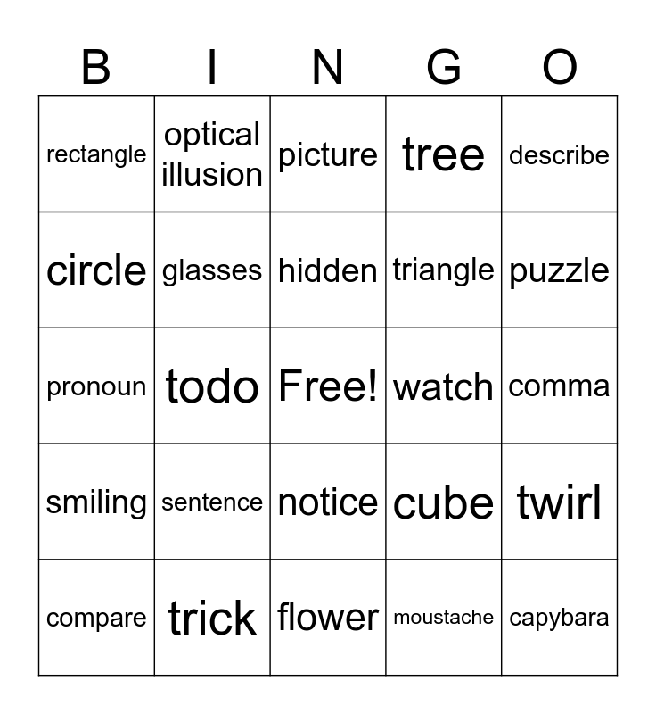 This bingo card has a free space and 24 words: sentence, trick, hidden, compare, describe, rectangle, circle, optical illusion, watch, notice, triangle, pronoun, cube, twirl, glasses, moustache, comma, picture, puzzle, todo, capybara, smiling, tree and flower.