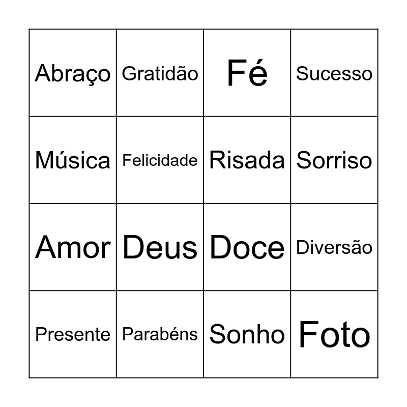 This bingo card has 24 words: Amizade, Festa, Sorriso, Alegria, Música, Abraço, Felicidade, Gratidão, Parabéns, Coração, Amor, Doce, Bolo, Carinho, Risada, Brinde, Sonho, Fé, Deus, Diversão, Presente, Foto, Sucesso and Amigas.