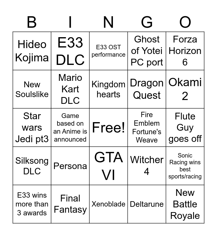 This bingo card has a free space and 24 words: Persona, Final Fantasy, Kingdom hearts, E33 wins more than 3 awards, Forza Horizon 6, Hideo Kojima, New Soulslike, E33 DLC, Fire Emblem Fortune's Weave, GTA VI, Dragon Quest, Star wars Jedi pt3, Witcher 4, Sonic Racing wins best sports/racing, Mario Kart DLC, Deltarune, Flute Guy goes off, E33 OST performance, Okami 2, Game based on an Anime is announced, New Battle Royale, Silksong DLC, Ghost of Yotei PC port and Xenoblade.