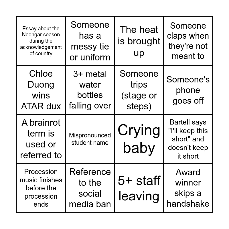 This bingo card has 16 words: Reference to the social media ban, Bartell says "I'll keep this short" and doesn't keep it short, The heat is brought up, Essay about the Noongar season during the acknowledgement of country, A brainrot term is used or referred to, Someone has a messy tie or uniform, Crying baby, 5+ staff leaving, Chloe Duong wins ATAR dux, 3+ metal water bottles falling over, Procession music finishes before the procession ends, Someone claps when they're not meant to, Mispronounced student name, Someone's phone goes off, Someone trips (stage or steps) and Award winner skips a handshake.