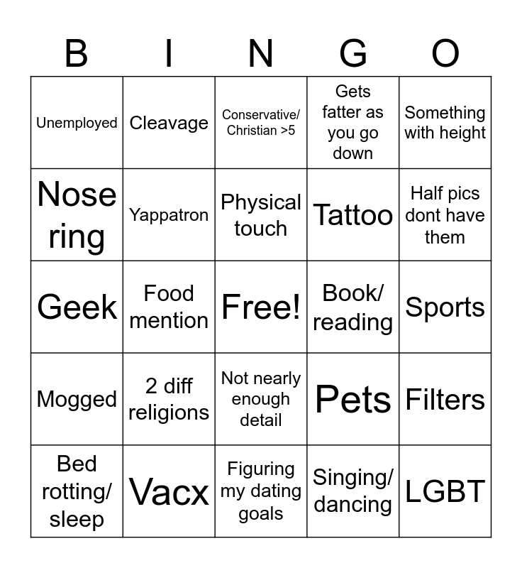 This bingo card has a free space and 24 words: 2 diff religions, Vacx, Physical touch, Bed rotting/ sleep, Something with height, Unemployed, Nose ring, Cleavage, Book/ reading, Not nearly enough detail, Tattoo, Geek, Pets, Filters, Yappatron, Singing/ dancing, Sports, Conservative/ Christian >5, Half pics dont have them, Food mention, LGBT, Mogged, Gets fatter as you go down and Figuring my dating goals.