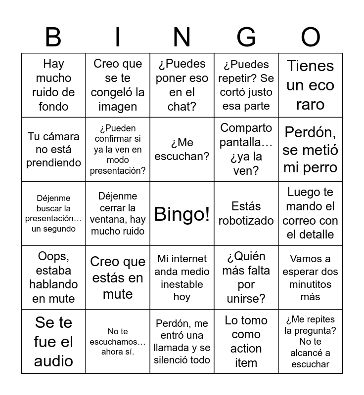 This bingo card has a free space and 24 words: Creo que estás en mute, No te escuchamos… ahora sí., ¿Me escuchan?, Se te fue el audio, Tienes un eco raro, Hay mucho ruido de fondo, Tu cámara no está prendiendo, Creo que se te congeló la imagen, Estás robotizado, Mi internet anda medio inestable hoy, Comparto pantalla… ¿ya la ven?, Déjenme buscar la presentación… un segundo, ¿Quién más falta por unirse?, Vamos a esperar dos minutitos más, ¿Pueden confirmar si ya la ven en modo presentación?, Lo tomo como action item, Luego te mando el correo con el detalle, ¿Puedes poner eso en el chat?, Perdón, se metió mi perro, Déjenme cerrar la ventana, hay mucho ruido, ¿Me repites la pregunta? No te alcancé a escuchar, Oops, estaba hablando en mute, ¿Puedes repetir? Se cortó justo esa parte and Perdón, me entró una llamada y se silenció todo.
