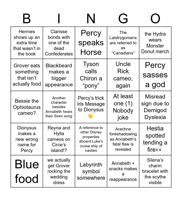 This bingo card has a free space and 24 words: Reyna and Hylla cameos on Circe’s island!?, we actually get Grover rocking the wedding dress, Tyson calls Chiron a “pony”, Blue food, the Hydra wears Monster Donut merch, Hermes shows up an extra time that wasn’t in the book, Grover eats something that isn’t actually food, Clarisse bonds with one of the dead Confederates, At least one (1) Nobody joke, A reference to other Disney properties aboard Luke’s cruise ship of nasties, Uncle Rick cameo, again, Bessie the Ophiotaurus cameo?, Arachne foreshadowing as Annabeth’s fatal flaw is revealed, Hestia spotted tending a fire👀, Blackbeard makes a bigger appearance, Annabeth + snacks makes a reappearance, Misread sign due to Demigod Dyslexia, Percy speaks Horse, Percy sasses a god, Another character besides Annabeth hears their Siren song, Silena’s charm bracelet with the scythe visible, Dionysus makes a new wrong name for Percy, The Laistrygonians are referred to as “Canadians” and Labyrinth symbol somewhere.