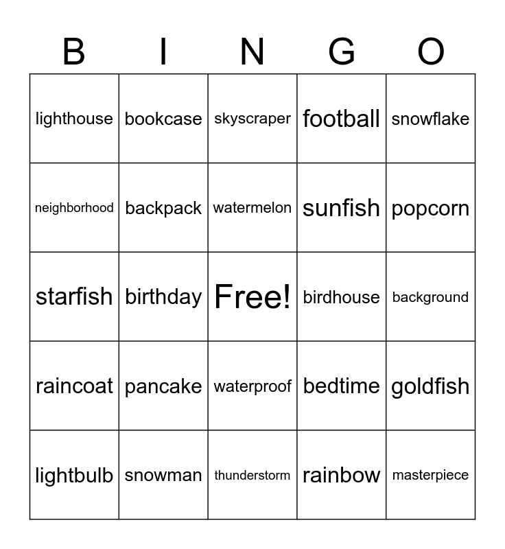 This bingo card has a free space and 34 words: dragonfly, rainbow, cupcake, sunflower, raincoat, backpack, snowflake, lightbulb, bookcase, sunlight, watermelon, skyscraper, basketball, earthquake, birdhouse, popcorn, snowman, starfish, pancake, bedtime, waterproof, wheelchair, lighthouse, background, thunderstorm, masterpiece, football, cowboy, sunfish, neighborhood, windshield, birthday, goldfish and inside.