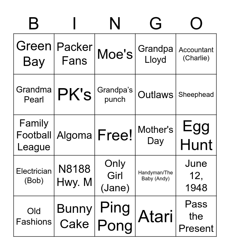 This bingo card has a free space and 29 words: Old Fashions, Round Robin, Algoma, Kewaunee, Green Bay, Moe's, PK's, N8188 Hwy. M, Mother's Day, Bunny Cake, Egg Hunt, Pass the Present, Ping Pong, Atari, Sheephead, Twins (Peter/Paul), Only Girl (Jane), Electrician (Bob), Accountant (Charlie), Family Football League, Handyman/The Baby (Andy), The Oldest (Dan), Outlaws, Grandma Pearl, Grandpa Lloyd, Packer Fans, June 12, 1948, Grandpa’s punch and Algoma Hardwoods.