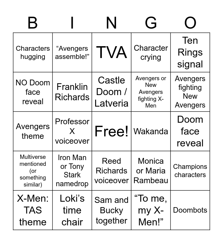 This bingo card has a free space and 24 words: Iron Man or Tony Stark namedrop, Loki’s time chair, Castle Doom / Latveria, X-Men: TAS theme, Ten Rings signal, Characters hugging, NO Doom face reveal, “Avengers assemble!”, Wakanda, Reed Richards voiceover, Avengers or New Avengers fighting X-Men, Avengers theme, Monica or Maria Rambeau, Champions characters, Franklin Richards, “To me, my X-Men!”, Doom face reveal, TVA, Avengers fighting New Avengers, Professor X voiceover, Doombots, Multiverse mentioned (or something similar), Character crying and Sam and Bucky together.
