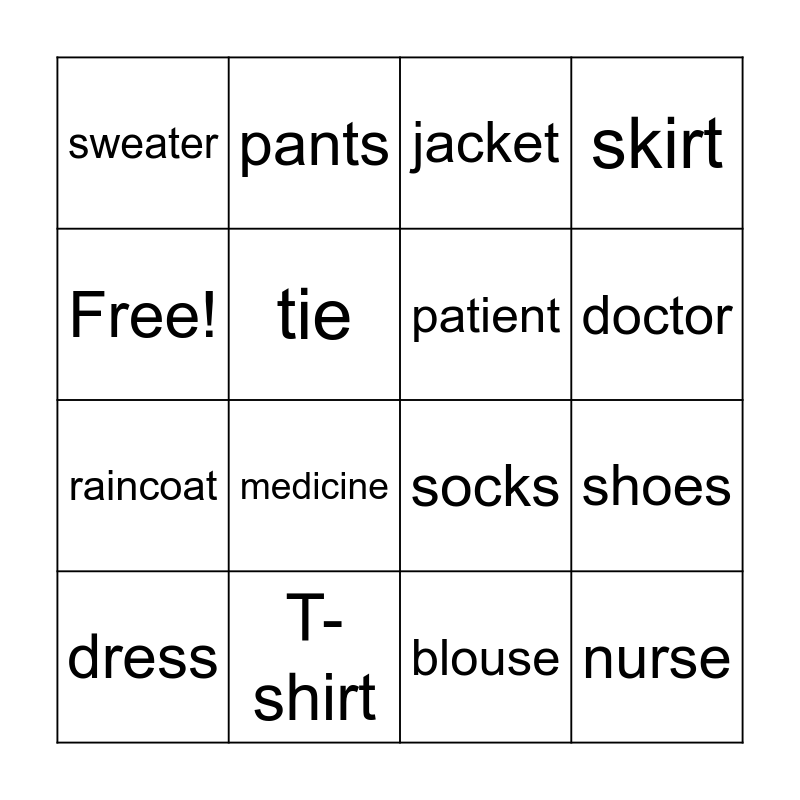 This bingo card has 16 words: T-shirt, shoes, jacket, sweater, raincoat, pants, socks, blouse, Free!, tie, dress, skirt, medicine, doctor, patient and nurse.