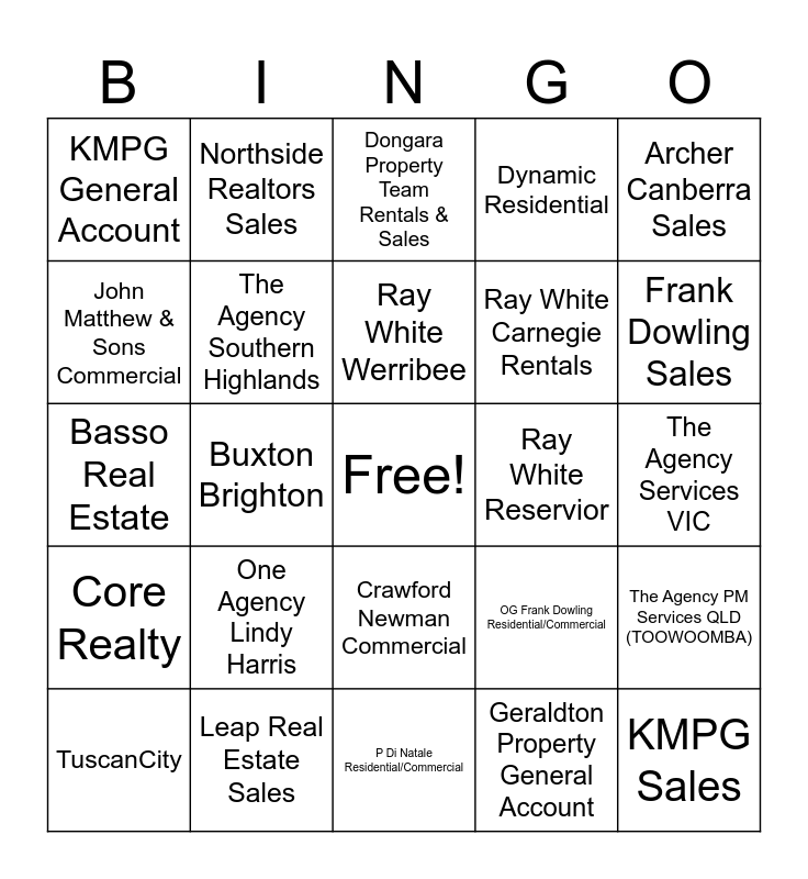 This bingo card has a free space and 106 words: Archer Canberra General Account, Gary Peer Bentleigh, Archer Canberra Sales, Archer NSW General Account, Gary Peer Caulfield, Archer NSW Sales, Ask Property, Ask Property Payroll, Avalon Real Estate Commercial, Gary Peer Murrembeena/Carnegie, Gary Peer St Kilda, BFG Asset Management, Brisbane Real Estate, Thomson Malvern Residential, Jellis Craig Albert Park Property Management, Cambridge Real Estate, Dongara Property Team Rentals & Sales, Century21 Clayton Rentals/Commercial, Century21 Clayton Sales, Jellis Craig Kensington Inner North West, Crawford Newman Commercial, Miles Real Estate Residential, DGI Properties, Dongara Property Team General Account, Morrison Kleeman, One Agency Lindy Harris, Frank Dowling Sales, Dynamic Residential, Gerldton Property Team, NEW Frank Dowling Residential/Commercial, OG Frank Dowling Residential/Commercial, Geraldton Property General Account, Buxton Bentleigh, HODGES Beaches, Hodges Beaumaris General Account, Hodges Bentleigh General Account, Hodges Brighton General Account, Hodges Mentone General Account, Ray White Werribee, Hodges Mentone Sales, Hodges Sandringham General Account, Hodges South Yarra General Account, IconIcity, Core Realty, KMPG Residential, John Matthew & Sons Commercial, John Matthew & Sons Residential & Sales, KMPG General Account, Archer Canberra Residential, KMPG Sales, Leap Real Estate Residential, Leap Real Estate Sales, LJ Hooker Point Cook, McIntyre Property Residential, Miles Real Estate Commercial, Archer NSW Residential, Avalon Real Estate Residential, Crawford Newman Residential, Northside Realtors Residential, Northside Realtors Sales, Property Initiatives Residential, Property Initiatives Sales, Ray White Altona Residential & Sales, Ray White Brunswick Residential, Centry21 Broken Hill, Property Managers Melbourne, Raine & Horne Brunswick, Raine & Horne Cranbourne, Ray White Carnegie Rentals, Basso Real Estate, Buxton Brighton, P Di Natale Residential/Commercial, Ray White Albury NSW, Ray White Brunswick Sales, Ray White Albury Sales, Ray White Carnegie Sales, Ray White Forest Hill, Ray White Geraldton Rentals, Ray White Geraldton Sales, Ray White Gladstone Park, Ray White Glen Waverley Commercial, Ray White Glen Waverley Sales, Ray White Judd White - DND Sales, Ray White Judd White - Monash Sales, Ray White Judd White- Monash Vision, Ray White Preston, Ray White Reservior, Ray White Albury VIC, Realmark Karratha Sales, The Agency Commerical, The Agency EAST, The Agency INNERWEST, The Agency Launceston, The Agency Management, The Agency NORTH, The Agency PM Services QLD (TOOWOOMBA), The Agency QLD, The Agency ROCKHAMPTON, The Agency SERVICES, The Agency Services VIC, The Agency Southern Highlands, The Agency VIC, The Agency WA, Hodges Mentone Residential, TuscanCity and Woodards Yarraville Sales.