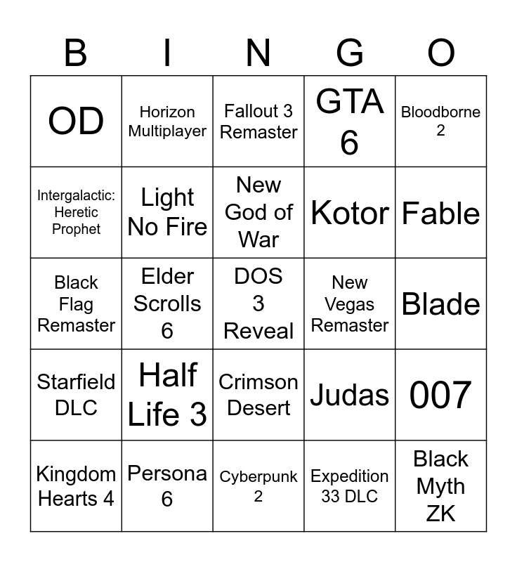 This bingo card has a free space and 24 words: Half Life 3, Persona 6, New God of War, Kingdom Hearts 4, Bloodborne 2, OD, Intergalactic: Heretic Prophet, Horizon Multiplayer, New Vegas Remaster, Crimson Desert, Kotor, Black Flag Remaster, Judas, 007, Light No Fire, Expedition 33 DLC, Blade, Fallout 3 Remaster, Fable, Elder Scrolls 6, Black Myth ZK, Starfield DLC, GTA 6 and Cyberpunk 2.