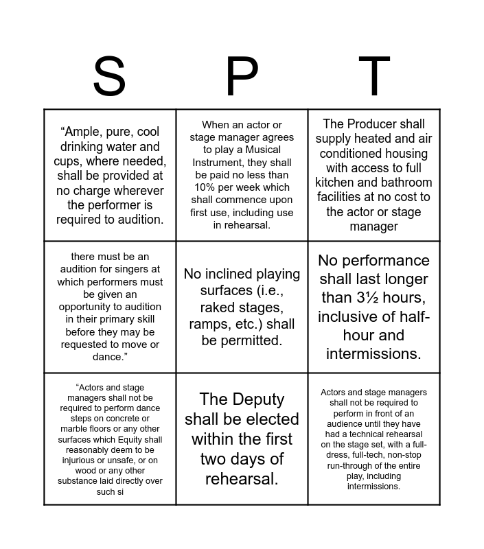 This bingo card has 12 words: Should there be less than two hours from curtain down to curtain up between performances, the Producer, at their own expense, shall provide the actors and stage managers with a meal at the theatre within 15 minutes of the conclusion of the first, Actors and stage managers shall not be required to perform in front of an audience until they have had a technical rehearsal on the stage set, with a full-dress, full-tech, non-stop run-through of the entire play, including intermissions., No inclined playing surfaces (i.e., raked stages, ramps, etc.) shall be permitted., No performance shall last longer than 3½ hours, inclusive of half-hour and intermissions., When an actor or stage manager agrees to play a Musical Instrument, they shall be paid no less than 10% per week which shall commence upon first use, including use in rehearsal., The Producer shall supply heated and air conditioned housing with access to full kitchen and bathroom facilities at no cost to the actor or stage manager, The Deputy shall be elected within the first two days of rehearsal., “No televising, filming, videotaping, or sound recording of Equity performers shall be permitted at any Equity audition”, “Ample, pure, cool drinking water and cups, where needed, shall be provided at no charge wherever the performer is required to audition., there must be an audition for singers at which performers must be given an opportunity to audition in their primary skill before they may be requested to move or dance.”, “Actors and stage managers shall not be required to perform dance steps on concrete or marble floors or any other surfaces which Equity shall reasonably deem to be injurious or unsafe, or on wood or any other substance laid directly over such si and “Separate change facilities (not lavatories) for men and women dancers”.