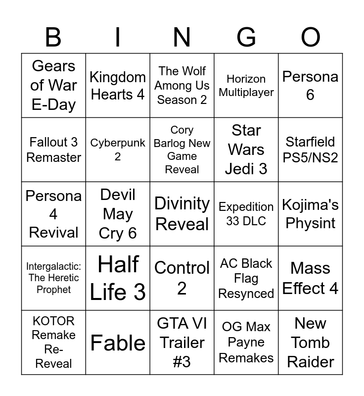 This bingo card has a free space and 24 words: Half Life 3, Fable, Cory Barlog New Game Reveal, KOTOR Remake Re-Reveal, Persona 6, Gears of War E-Day, Fallout 3 Remaster, Kingdom Hearts 4, Expedition 33 DLC, Control 2, Star Wars Jedi 3, Persona 4 Revival, AC Black Flag Resynced, Mass Effect 4, Cyberpunk 2, OG Max Payne Remakes, Kojima's Physint, The Wolf Among Us Season 2, Starfield PS5/NS2, Devil May Cry 6, New Tomb Raider, Intergalactic: The Heretic Prophet, Horizon Multiplayer and GTA VI Trailer #3.