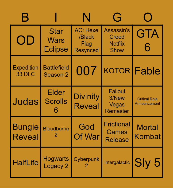 This bingo card has a free space and 24 words: Bloodborne 2, Hogwarts Legacy 2, 007, HalfLife, GTA 6, OD, Expedition 33 DLC, Star Wars Eclipse, Fallout 3/New Vegas Remaster, God Of War, KOTOR, Judas, Frictional Games Release, Mortal Kombat, Battlefield Season 2, Intergalactic, Critical Role Announcement, AC: Hexe /Black Flag Resynced, Fable, Elder Scrolls 6, Sly 5, Bungie Reveal, Assassin's Creed Netflix Show and Cyberpunk 2.