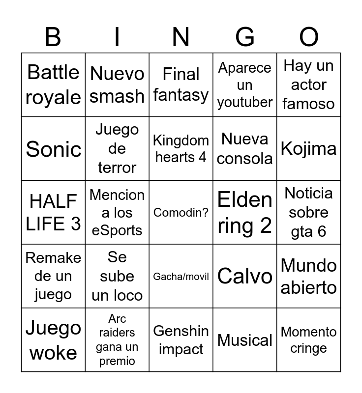 This bingo card has a free space and 24 words: Se sube un loco, Arc raiders gana un premio, Kingdom hearts 4, Juego woke, Hay un actor famoso, Battle royale, Sonic, Nuevo smash, Elden ring 2, Gacha/movil, Nueva consola, HALF LIFE 3, Calvo, Mundo abierto, Juego de terror, Musical, Noticia sobre gta 6, Final fantasy, Kojima, Mencion a los eSports, Momento cringe, Remake de un juego, Aparece un youtuber and Genshin impact.