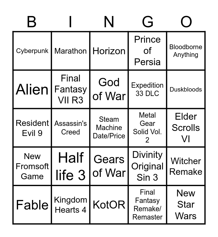 This bingo card has 25 words: Half life 3, KotOR, God of War, Fable, Bloodborne Anything, Cyberpunk, Alien, Marathon, Metal Gear Solid Vol. 2, Gears of War, Expedition 33 DLC, Resident Evil 9, Divinity Original Sin 3, Witcher Remake, Final Fantasy VII R3, New Star Wars, Elder Scrolls VI, Horizon, Duskbloods, Assassin's Creed, Steam Machine Date/Price, Kingdom Hearts 4, New Fromsoft Game, Prince of Persia and Final Fantasy Remake/ Remaster.