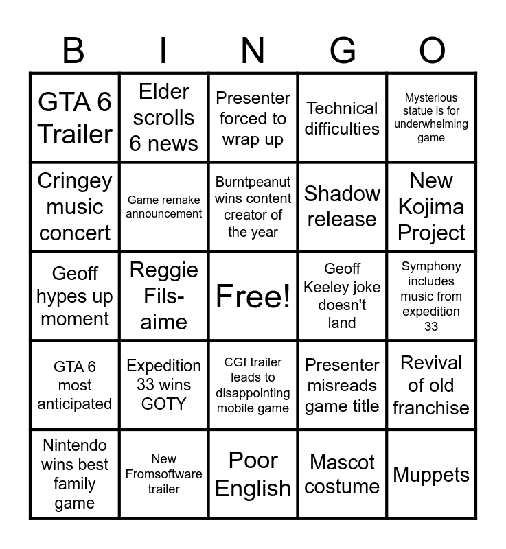 This bingo card has a free space and 24 words: Expedition 33 wins GOTY, New Fromsoftware trailer, Burntpeanut wins content creator of the year, Nintendo wins best family game, Mysterious statue is for underwhelming game, GTA 6 Trailer, Cringey music concert, Elder scrolls 6 news, Geoff Keeley joke doesn't land, CGI trailer leads to disappointing mobile game, Shadow release, Geoff hypes up moment, Presenter misreads game title, Revival of old franchise, Game remake announcement, Mascot costume, Symphony includes music from expedition 33, Presenter forced to wrap up, New Kojima Project, Reggie Fils-aime, Muppets, GTA 6 most anticipated, Technical difficulties and Poor English.