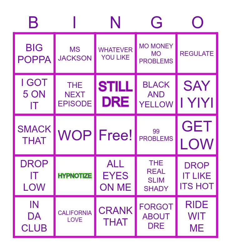 This bingo card has a free space and 24 words: HYPNOTIZE, CALIFORNIA LOVE, STILL DRE, IN DA CLUB, REGULATE, BIG POPPA, I GOT 5 ON IT, MS JACKSON, 99 PROBLEMS, ALL EYES ON ME, BLACK AND YELLOW, SMACK THAT, THE REAL SLIM SHADY, DROP IT LIKE ITS HOT, THE NEXT EPISODE, FORGOT ABOUT DRE, GET LOW, WHATEVER YOU LIKE, SAY I YIYI, WOP, RIDE WIT ME, DROP IT LOW, MO MONEY MO PROBLEMS and CRANK THAT.