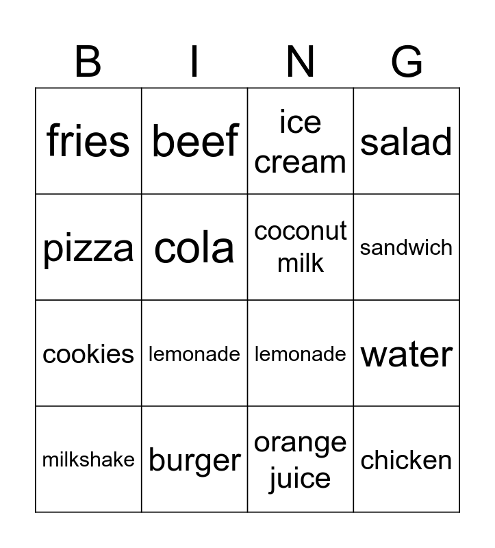 This bingo card has 22 words: burger, egg, beef, fish, cola, coconut milk, fries, ice cream, lemonade, chicken, cookies, salad, cheese, coffee, orange juice, tea, water, milkshake, lemonade, pizza, sandwich and tea.