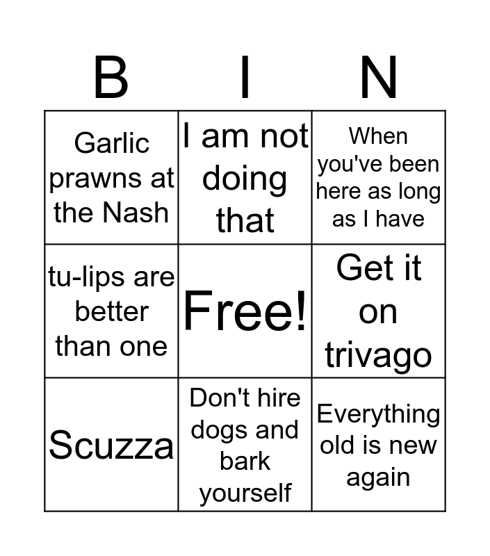This bingo card has a free space and 25 words: Cost per wear, Do you know what I think, Don't hire dogs and bark yourself, Don't mess with perfection, Everything old is new again, Garlic prawns at the Nash, Get it on trivago, I am not doing that, I don't think so, I don't want to come to lunch, KISS- keep it simple stupid, Mall rats, Mole, Nadia Bartel, Scuzza, Something's crook in tullarook, We need a retail strategy, When you've been here as long as I have, You need to get into the property market Kathleen, You there Waitsy?, You've gotta watch 'If you are the one', middens, kiddens and buttons, on the spectrum, tu-lips are better than one and That's three hours I will never get back.