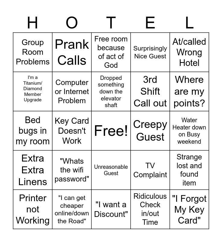 This bingo card has a free space and 49 words: Kids Running In the Halls, "I Forgot My Key Card", Request a room away from all other Guests, "I want a Discount", "Whats the wifi password", Parents Not Watching Their Kids, Prank Calls, "This is in the middle of nowhere", I'm a Titanium/ Diamond Member Upgrade, Credit Card Dispute, Computer or Internet Problem, Surprisingly Nice Guest, Strange lost and found item, TV Complaint, "Is that the best you can do?", Pool Intruders after hours, Dropped something down the elevator shaft, Creepy Guest, Drunk/High Guest, At/called Wrong Hotel, Key Card Doesn't Work, Ridiculous Check in/out Time, Group Room Problems, 3rd Shift Call out, Penny-Pinching Walk-in, Where are my points?, Printer not Working, Locked Their keys in room, Unreasonable Guest, Extra Extra Linens, Noise Complaint, Stupid Guest, Reports Didn't Print, 3rd Party Guest Wants Upgrade, "I can get cheaper online/down the Road", "It's too hot/cold", "They said I can get a Shuttle Anytime!", "Is This That Place from the News?", Water Heater down on Busy weekend, Guest doesn't understand authorization vs Charge, Wildlife in/out hotel, "I have my Service Cat with Me.", This is Mr. Patel the owner..., Room Change Request an Hour Later, Bed bugs in my room, Free room because of act of God, Free room because pool is closed (after hour check in), "No one every asks for a cash deposit" and I travel all the time never heard of a required deposit.