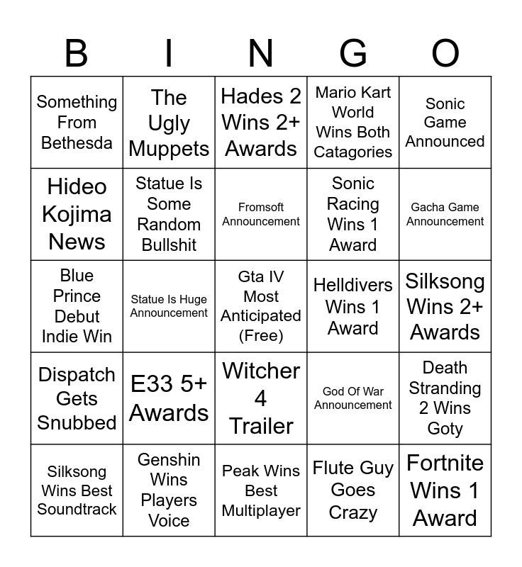 This bingo card has a free space and 24 words: E33 5+ Awards, Genshin Wins Players Voice, Fromsoft Announcement, Silksong Wins Best Soundtrack, Sonic Game Announced, Something From Bethesda, Hideo Kojima News, The Ugly Muppets, Helldivers Wins 1 Award, Witcher 4 Trailer, Sonic Racing Wins 1 Award, Blue Prince Debut Indie Win, God Of War Announcement, Death Stranding 2 Wins Goty, Statue Is Some Random Bullshit, Flute Guy Goes Crazy, Silksong Wins 2+ Awards, Hades 2 Wins 2+ Awards, Gacha Game Announcement, Statue Is Huge Announcement, Fortnite Wins 1 Award, Dispatch Gets Snubbed, Mario Kart World Wins Both Catagories and Peak Wins Best Multiplayer.