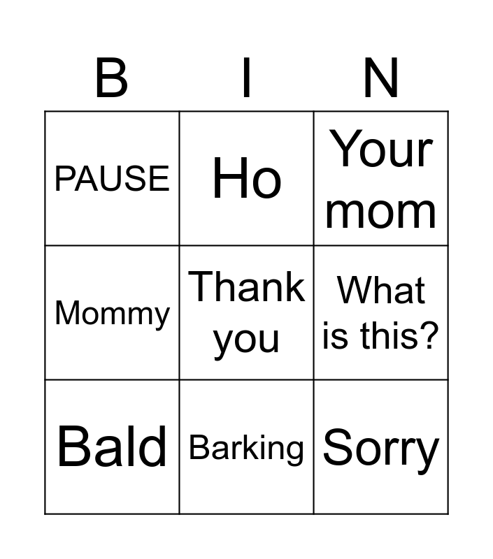 This bingo card has 9 words: Bald, Your mom, Ho, Mommy, PAUSE, What is this?, Thank you, Sorry and Barking.