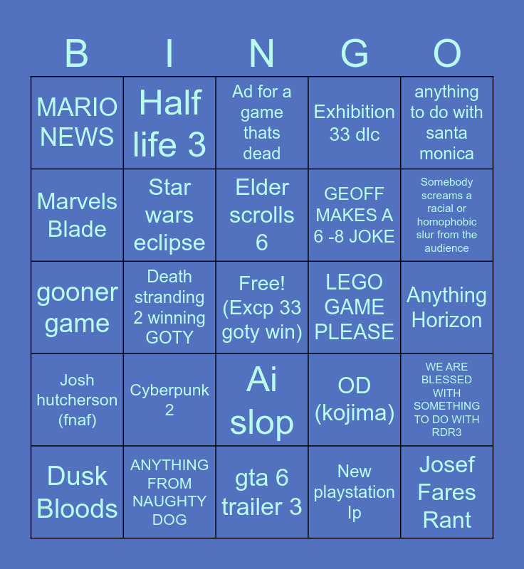 This bingo card has a free space and 24 words: Cyberpunk 2, ANYTHING FROM NAUGHTY DOG, Elder scrolls 6, Dusk Bloods, anything to do with santa monica, MARIO NEWS, Marvels Blade, Half life 3, LEGO GAME PLEASE, Ai slop, GEOFF MAKES A 6 -8 JOKE, gooner game, OD (kojima), WE ARE BLESSED WITH SOMETHING TO DO WITH RDR3, Star wars eclipse, New playstation Ip, Anything Horizon, Ad for a game thats dead, Somebody screams a racial or homophobic slur from the audience, Death stranding 2 winning GOTY, Josef Fares Rant, Josh hutcherson (fnaf), Exhibition 33 dlc and gta 6 trailer 3.