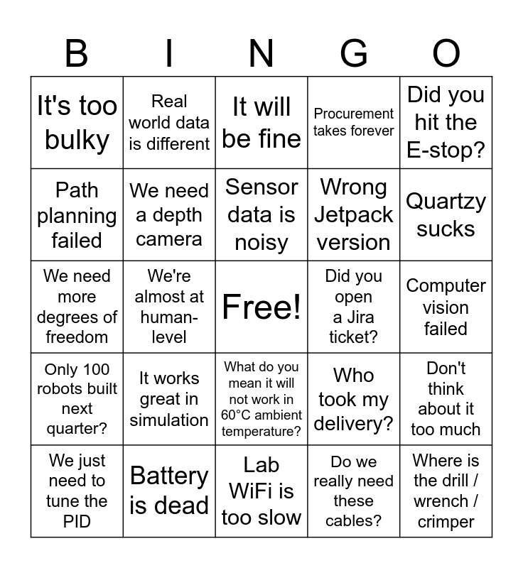 This bingo card has a free space and 24 words: It works great in simulation, Battery is dead, Sensor data is noisy, We just need to tune the PID, Did you hit the E-stop?, It's too bulky, Path planning failed, Real world data is different, Did you open a Jira ticket?, What do you mean it will not work in 60°C ambient temperature?, Wrong Jetpack version, We need more degrees of freedom, Who took my delivery?, Don't think about it too much, We need a depth camera, Do we really need these cables?, Computer vision failed, It will be fine, Quartzy sucks, We're almost at human-level, Where is the drill / wrench / crimper, Only 100 robots built next quarter?, Procurement takes forever and Lab WiFi is too slow.