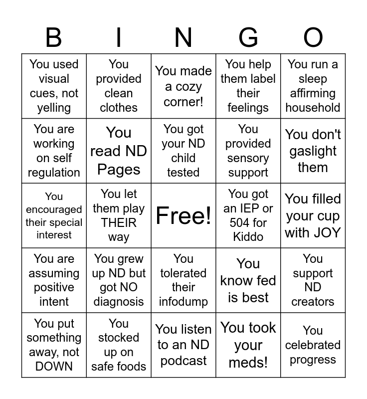 This bingo card has a free space and 24 words: You grew up ND but got NO diagnosis, You stocked up on safe foods, You got your ND child tested, You put something away, not DOWN, You run a sleep affirming household, You used visual cues, not yelling, You are working on self regulation, You provided clean clothes, You got an IEP or 504 for Kiddo, You tolerated their infodump, You provided sensory support, You encouraged their special interest, You know fed is best, You support ND creators, You read ND Pages, You took your meds!, You filled your cup with JOY, You made a cozy corner!, You don't gaslight them, You let them play THEIR way, You celebrated progress, You are assuming positive intent, You help them label their feelings and You listen to an ND podcast.