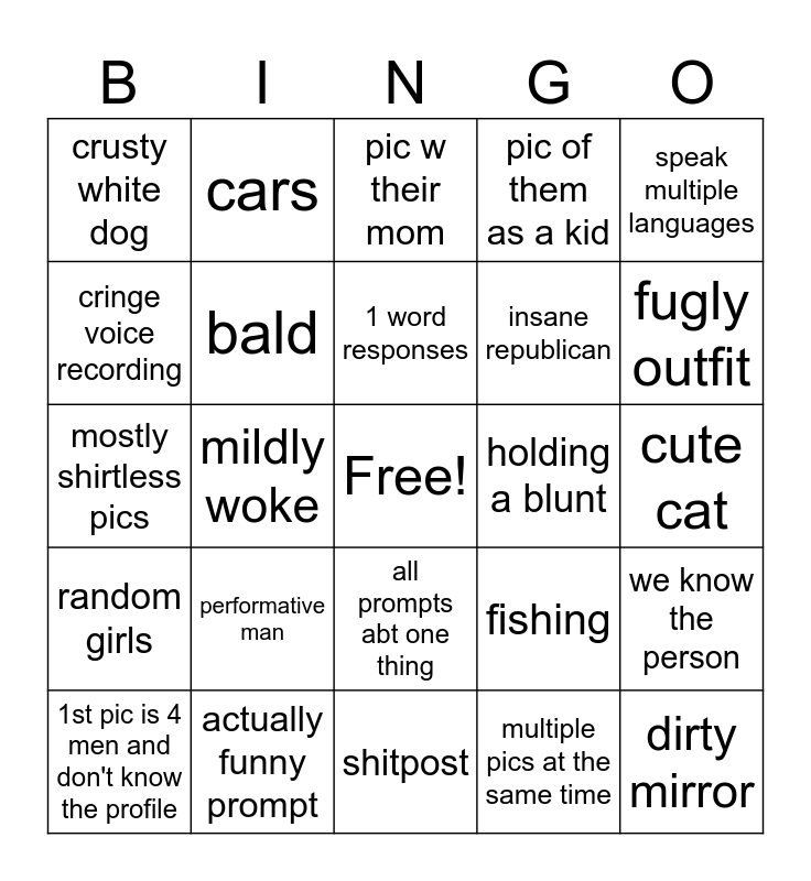 This bingo card has a free space and 24 words: performative man, actually funny prompt, 1 word responses, 1st pic is 4 men and don't know the profile, speak multiple languages, crusty white dog, cringe voice recording, cars, holding a blunt, all prompts abt one thing, insane republican, mostly shirtless pics, fishing, we know the person, bald, multiple pics at the same time, cute cat, pic w their mom, fugly outfit, mildly woke, dirty mirror, random girls, pic of them as a kid and shitpost.