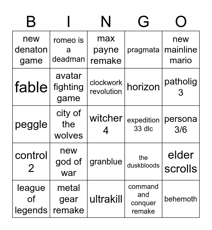 This bingo card has 25 words: new god of war, ultrakill, clockwork revolution, league of legends, new mainline mario, new denaton game, fable, romeo is a deadman, expedition 33 dlc, granblue, horizon, peggle, the duskbloods, elder scrolls, avatar fighting game, behemoth, persona 3/6, max payne remake, patholig 3, city of the wolves, witcher 4, metal gear remake, control 2, pragmata and command and conquer remake.
