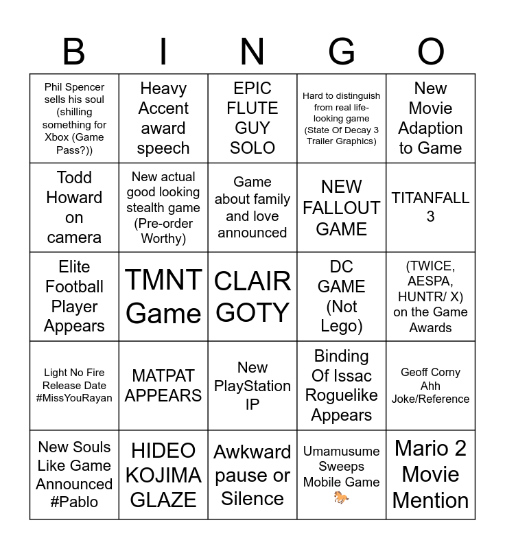 This bingo card has a free space and 24 words: MATPAT APPEARS, HIDEO KOJIMA GLAZE, Game about family and love announced, New Souls Like Game Announced #Pablo, New Movie Adaption to Game, Phil Spencer sells his soul (shilling something for Xbox (Game Pass?)), Todd Howard on camera, Heavy Accent award speech, DC GAME (Not Lego), New PlayStation IP, NEW FALLOUT GAME, Elite Football Player Appears, Binding Of Issac Roguelike Appears, Geoff Corny Ahh Joke/Reference, New actual good looking stealth game (Pre-order Worthy), Umamusume Sweeps Mobile Game🐎, (TWICE, AESPA, HUNTR/ X) on the Game Awards, EPIC FLUTE GUY SOLO, TITANFALL 3, TMNT Game, Mario 2 Movie Mention, Light No Fire Release Date #MissYouRayan, Hard to distinguish from real life-looking game (State Of Decay 3 Trailer Graphics) and Awkward pause or Silence.