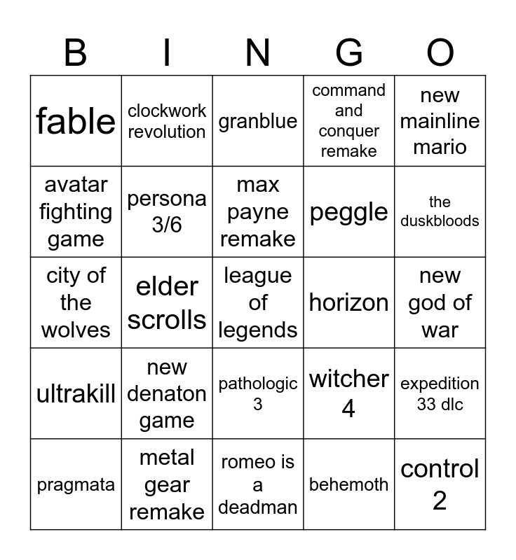 This bingo card has 25 words: new denaton game, romeo is a deadman, max payne remake, pragmata, new mainline mario, fable, avatar fighting game, clockwork revolution, horizon, pathologic 3, peggle, city of the wolves, witcher 4, expedition 33 dlc, persona 3/6, control 2, new god of war, granblue, the duskbloods, elder scrolls, league of legends, metal gear remake, ultrakill, command and conquer remake and behemoth.