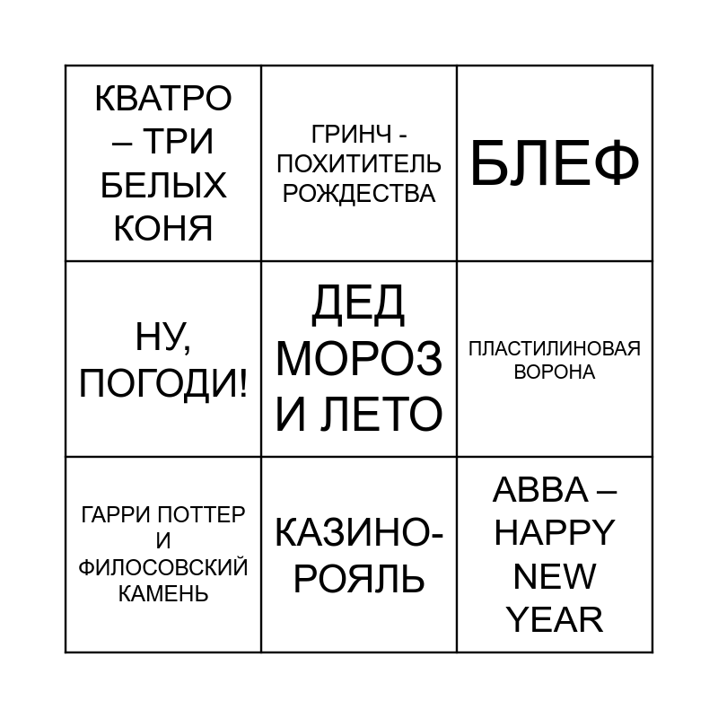 This bingo card has 15 words: ДИСКОТЕКА АВАРИЯ - НОВОГОДНЯЯ, КАРНАВАЛЬНАЯ НОЧЬ, БЛЕФ, КВАТРО – ТРИ БЕЛЫХ КОНЯ, КАЗИНО-РОЯЛЬ, ДЕД МОРОЗ И ЛЕТО, ТОМ И ДЖЕРРИ, КАЗИНО, ПЛАСТИЛИНОВАЯ ВОРОНА, ABBA – HAPPY NEW YEAR, BRENDA LEE – ROCKING AROUND, НУ, ПОГОДИ!, ГАРРИ ПОТТЕР И ФИЛОСОВСКИЙ КАМЕНЬ, ГРИНЧ - ПОХИТИТЕЛЬ РОЖДЕСТВА and ОДИН ДОМА.