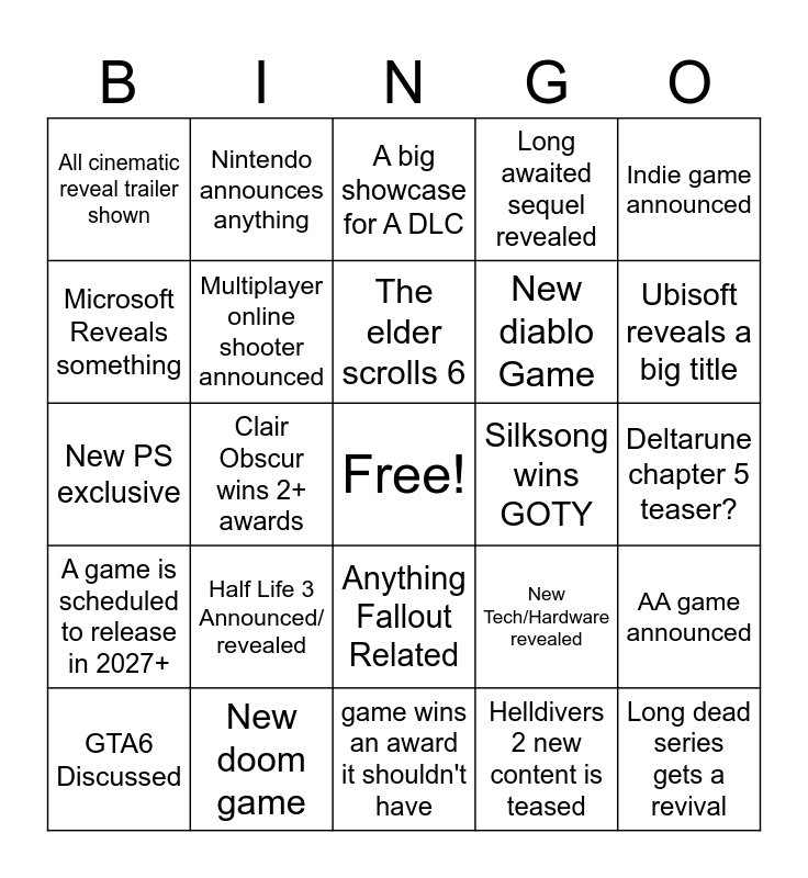 This bingo card has a free space and 24 words: Half Life 3 Announced/ revealed, New doom game, The elder scrolls 6, GTA6 Discussed, Indie game announced, All cinematic reveal trailer shown, Microsoft Reveals something, Nintendo announces anything, Silksong wins GOTY, Anything Fallout Related, New diablo Game, New PS exclusive, New Tech/Hardware revealed, AA game announced, Multiplayer online shooter announced, Helldivers 2 new content is teased, Deltarune chapter 5 teaser?, A big showcase for A DLC, Ubisoft reveals a big title, Clair Obscur wins 2+ awards, Long dead series gets a revival, A game is scheduled to release in 2027+, Long awaited sequel revealed and game wins an award it shouldn't have.