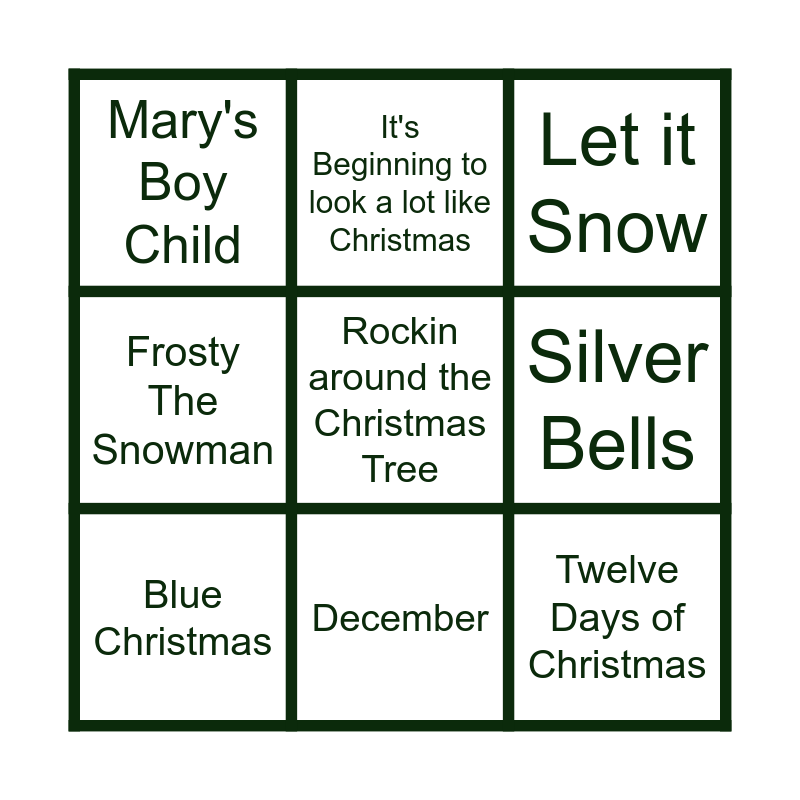 This bingo card has 61 words: All I want for Christmas is You, Santa Tell Me, Baby it's Cold outside, Last Christmas, Driving Home for Christmas, Deck the Hall's, Blue Christmas, Underneath The Tree, Twelve Days of Christmas, Run Rudolph Run, Frosty The Snowman, Sleigh Ride, Silver Bells, Holly Jolly Christmas, Jingle Bell Rock, Mary's Boy Child, Can't Stop Christmas, Rockin around the Christmas Tree, Merry Christmas Everyone, December, Merry Christmas Everybody, Let it Snow, One More Sleep, I wish it could be Christmas Everyday, Christmas (Baby Please Come Home), Rudolph the red nose Reindeer, Jingle Bells, Step into Christmas, Stop the Cavalry, Must Be Santa, Feliz Navidad, Silent Night, Fairytale of New York, Mistletoe and Wine, It's Beginning to look a lot like Christmas, Walking in the air, Do you Hear what I Hear, Warm this Winter, Do They Know it's Christmas, White Christmas, Thank God it's Christmas, I saw Mummy Kissing Santa Claus, Wonderful Christmas Time, Mistletoe, It's the most wonderful time of the year, Come on home for Christmas, Ernie Fastest Milkman in the West, It's only Make Believe, Moon River, I hear you Knocking, Save your love, I have a Dream, Day Tripper, Don't you want me, Mull of Kintyre, Stay another Day, Long Haired lover from Liverpool, Lilly the pink, Reet Pettite, Just walkin in the Rain and Xmas-Kylie.